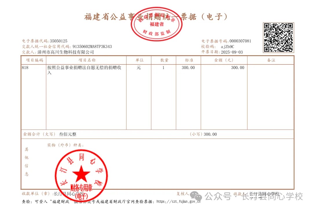 慈善捐赠总额为:300.00元,捐赠发票公示如下: