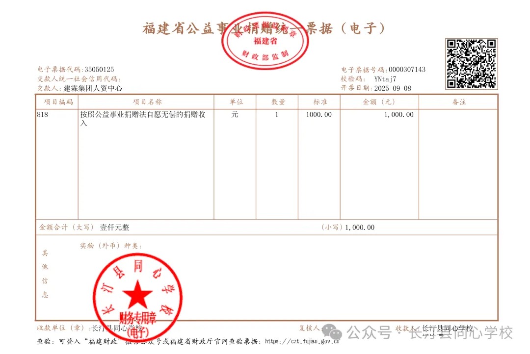 慈善捐赠总额为:1000.00元,捐赠发票公示如下: