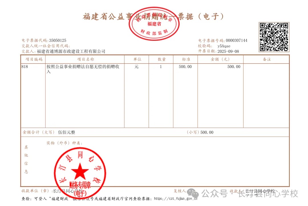 慈善捐赠总额为:500.00元,捐赠发票公示如下: