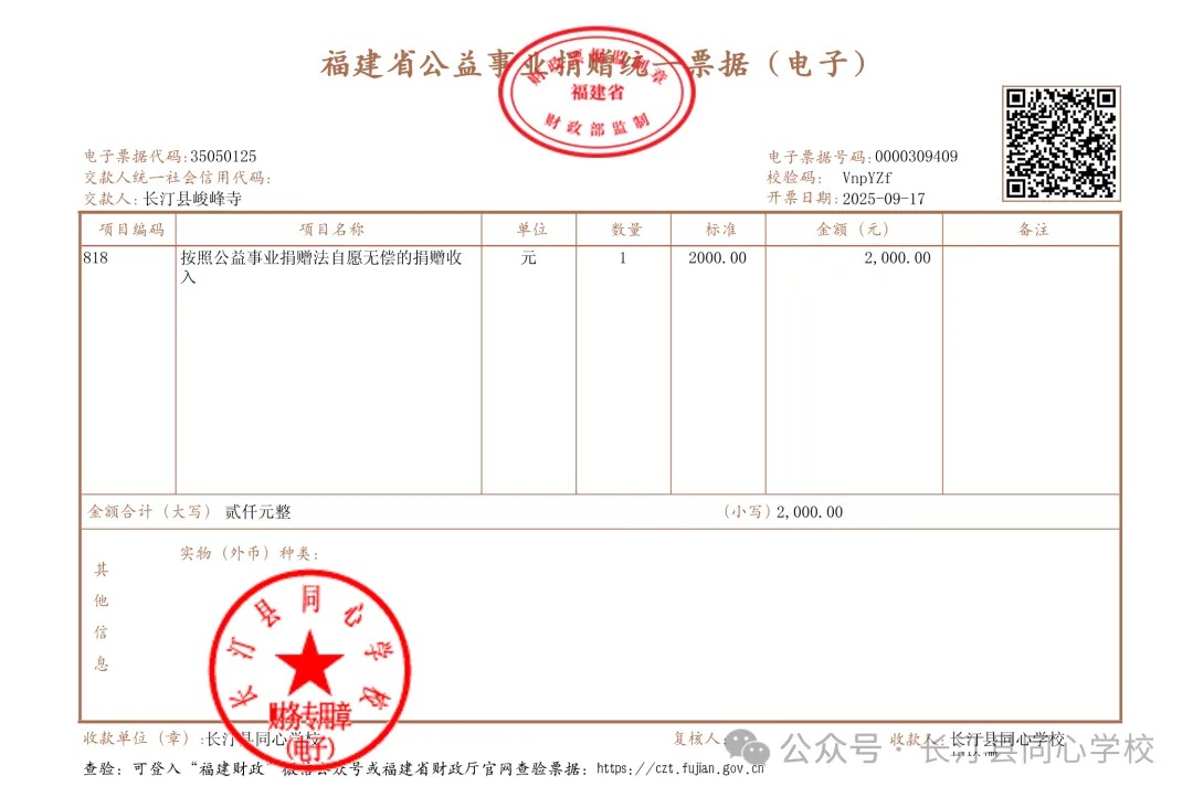慈善捐赠总额为:2000.00元,捐赠发票公示如下:
